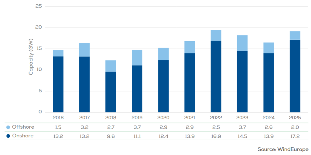 En 2025, l’Europe a installé 19 GW de nouvelle capacité éolienne (dont 15 GW dans l’Union européenne). La très grande majorité de celle-ci a été porté par le secteur onshore : 90 %, rien que ça ! Un taux qui devrait néanmoins laisser un peu plus de place à l’offshore, puisque les estimations de WindEurope tablent sur 77 % dans les années à venir pour l’onshore.