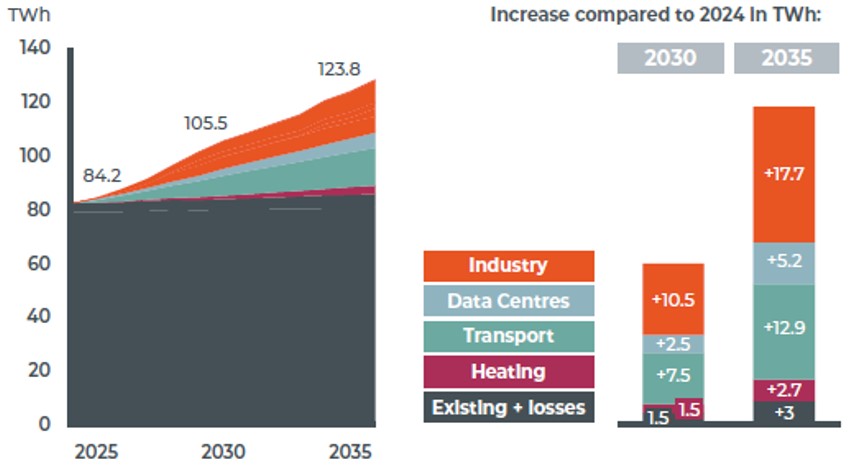 Pour le scénario central (« Current commitments »), la consommation électrique belge passerait de 84 TWh en 2026 à 124 TWh en 2036, soit une hausse de près de 50%. Cette augmentation s’explique par la future électrification de secteurs qui se reposent sur les énergies fossiles (transport, chauffage, industrie). Le graphe ci-dessous montre l’évolution de la consommation par secteur en 2030 et 2035.