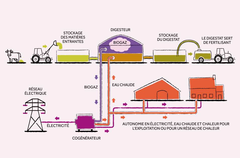 À la fin du processus, on obtient du digestat (fertilisant) et du biogaz. Ce dernier pourra être valorisé dans différentes productions d’énergie : chaleur (par combustion dans une chaudière), électricité (par combustion actionnant un alternateur ou par la production de vapeur actionnant une turbine, puis un alternateur), électricité et chaleur (par cogénération), ou biométhane (en épurant le CO₂ et en compressant le biogaz).