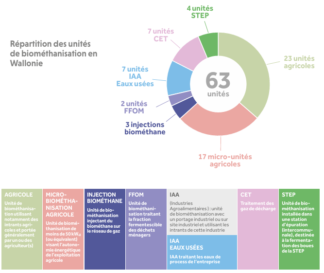 En 2023, la Wallonie comptait 63 unités de biométhanisation, dont une majorité dans le secteur agricole, qui totalisait 40 sites, dont 17 micro-unités. Trois de ces unités agricoles injectent même du biométhane sur le réseau de gaz.