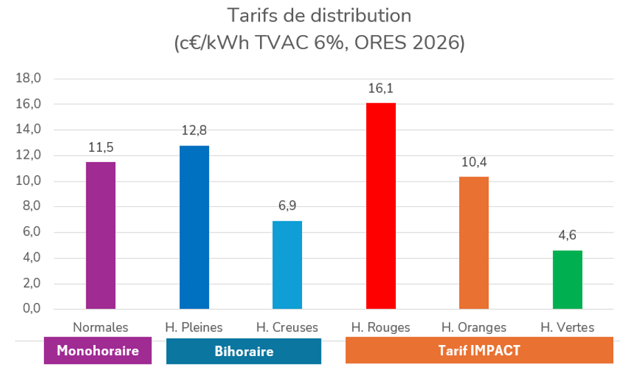 Étant donné que les fournisseurs d’énergie n’ont pas (encore) de contrat qui se calque sur les mêmes plages horaires que le tarif de distribution Impact, les plages horaires de votre contrat d’énergie seront différentes de celles de vos frais de distribution. Ce n’est pas problématique, mais si vous optez pour le tarif Impact, il sera préférable de choisir le bihoraire pour la partie fourniture puisque les plages horaires sont très similaires. Le graphique ci-dessous présente les tarifs de distribution en vigueur chez ORES pour l’année 2026 :