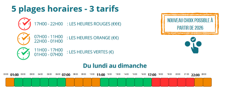 Nous vous parlions déjà du changement d’horaire du bihoraire il y a quelques semaines. A côté de cela, il y a également l’arrivée du tarif « Impact » qui est composé de 5 plages horaires et 3 tarifs différents. Le tarif Impact nécessite d’avoir un compteur communicant.